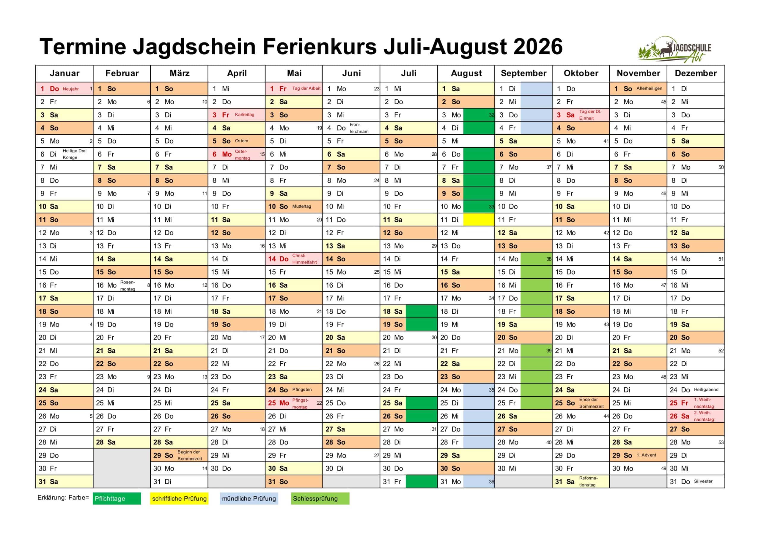 Das Ministerium in Bayern gibt für die "mündliche Prüfung" sowie für die "Schiessprüfung" den Jagdschulen immer die Kalenderwochen an an denen die Prüfung statt findet . Nachdem Sie die schriftliche Prüfung absolviert haben bekommen Sie ca.2-3 Tage später vom Ministerium per Post Ihren Prüfungstag für die "mündliche Prüfung" mitgeteilt. Dieser eine Tag an dem Sie an der Prüfung teil nehmen müssen liegt in den Kalenderwochen das das Ministerum angibt. Ebenfalls erhalten Sie nach bestandener "mündlichen Prüfung" den Tag der Schiessprüfung mitgeteilt.